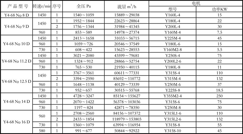 (5)產(chǎn)品全稱舉例如下:GY4-68No.8D右90,其中G、Y分別表示鍋爐通風(fēng)機(jī)與鍋爐引風(fēng)機(jī)。