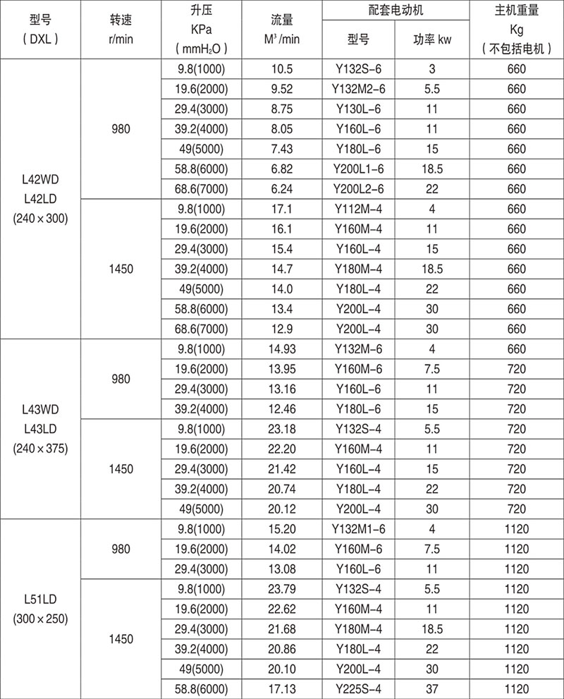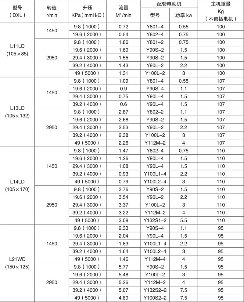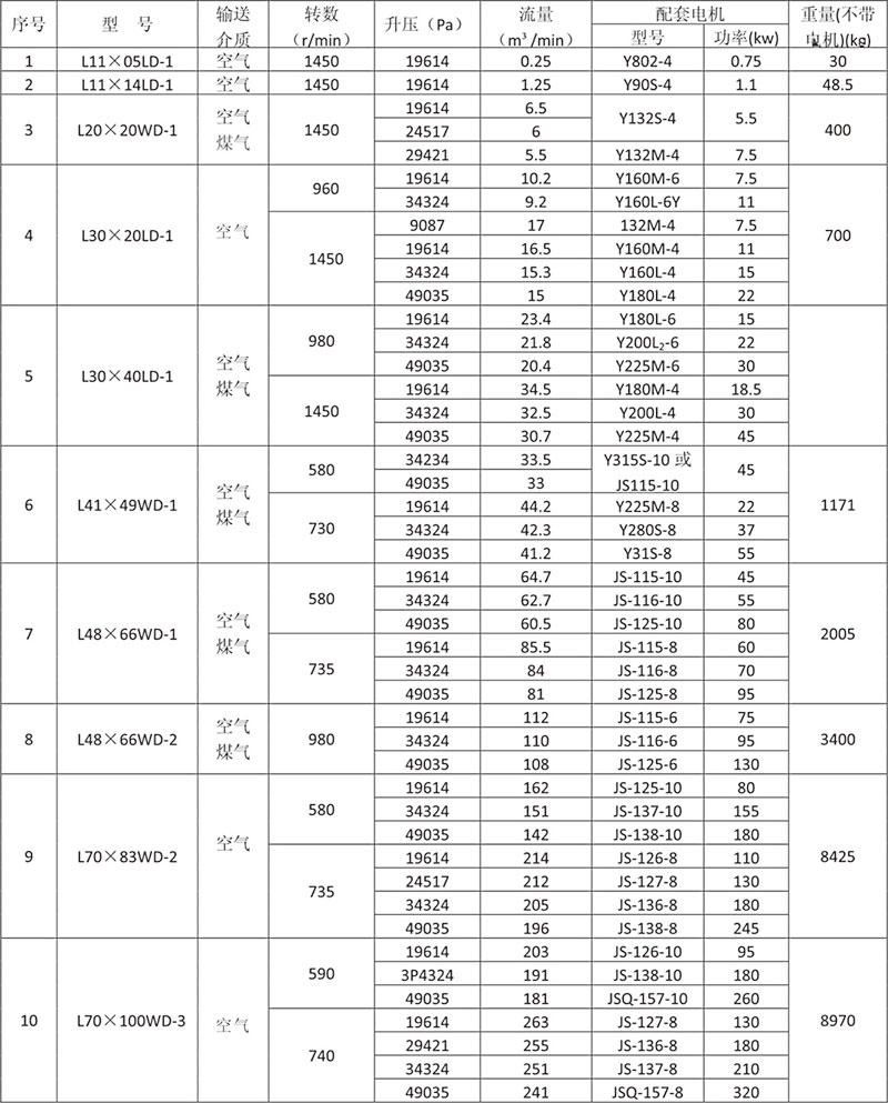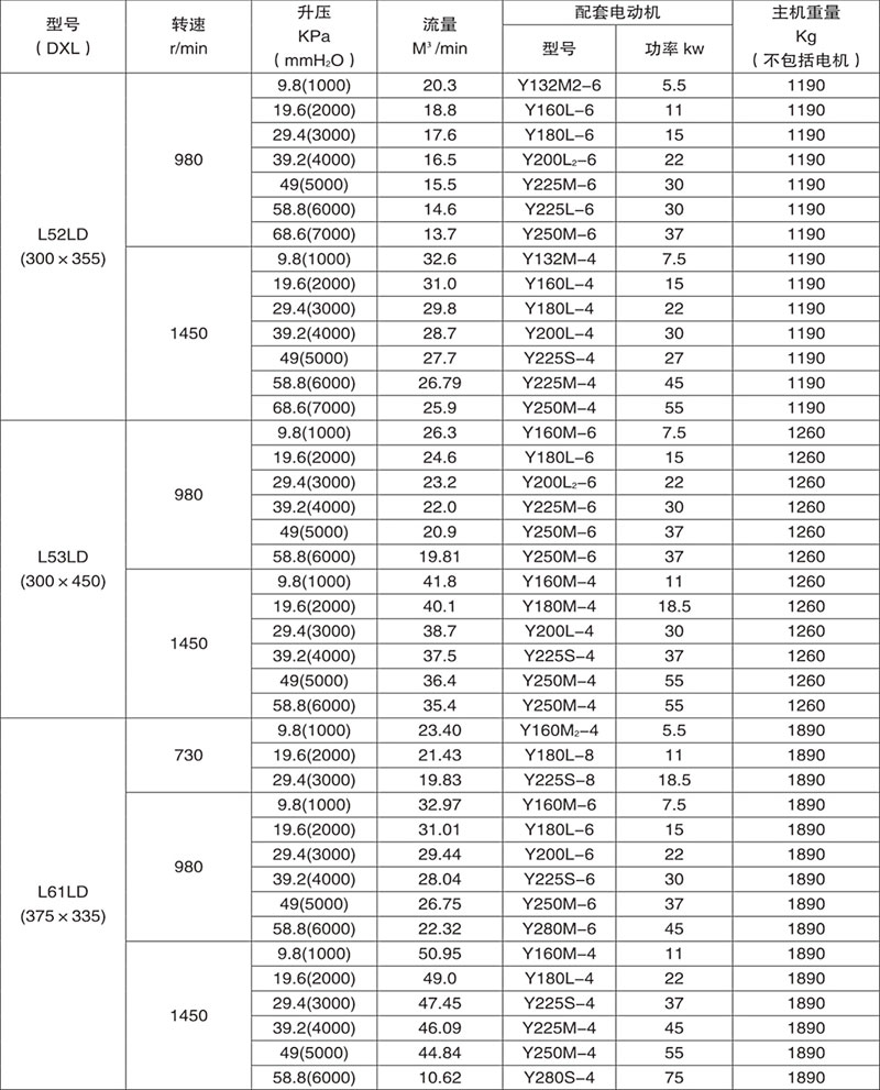羅茨鼓風(fēng)機(jī)性能參數(shù)表