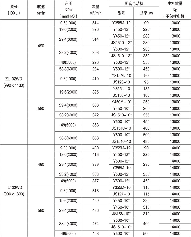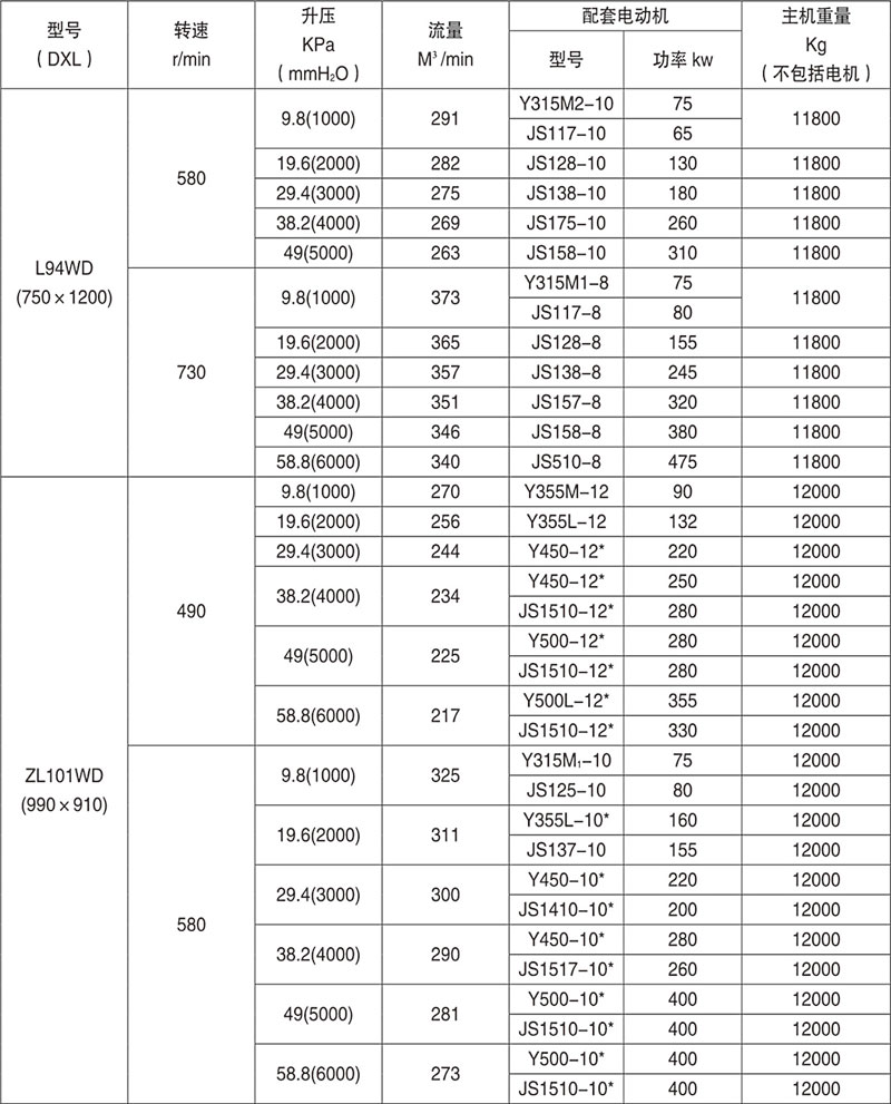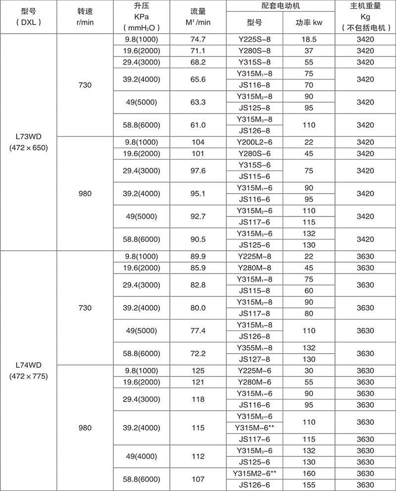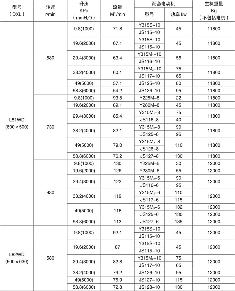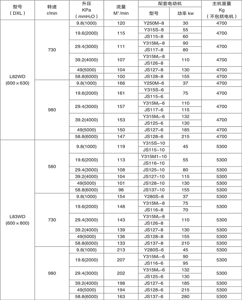 羅茨鼓風(fēng)機(jī)性能參數(shù)表
