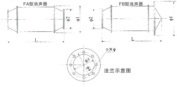 F型消聲器分為A、B兩種形式。A型兩端均為法蘭,可串接于管道中使用,B型一端是法蘭,另一端為防雨吸聲風(fēng)帽。可供進、排風(fēng)使用。